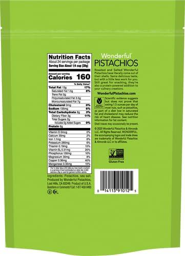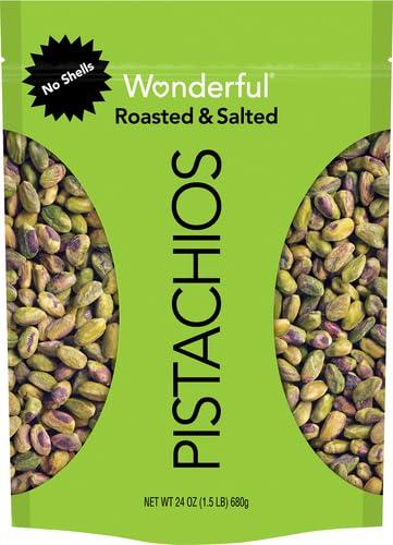 - SIZE: Net Wt 24 Ounce (1.5 lbs) 680 g No Shells - Our Wonderful Pistachios 24 ounce bag is the perfect snack to have around the house. Pistachios are gluten free, nutritious, & a protein powered snack. See nutrition information for fat content.